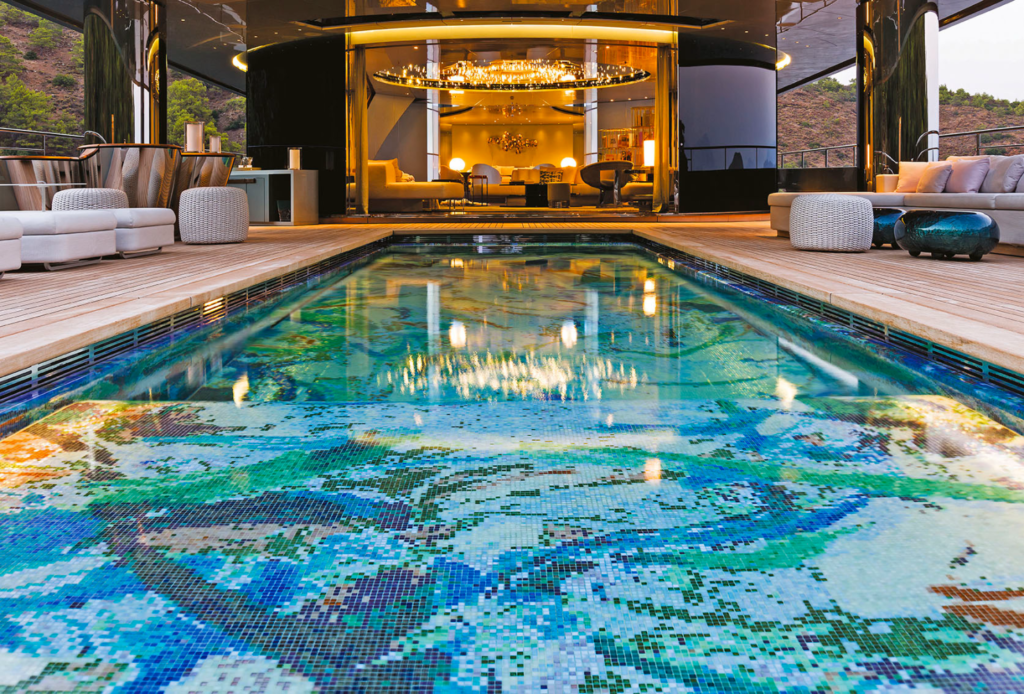 The superyacht Savannah, now showcased in the Netflix film “The Woman in Cabin 10”, features a striking custom mosaic pool designed by SICIS.